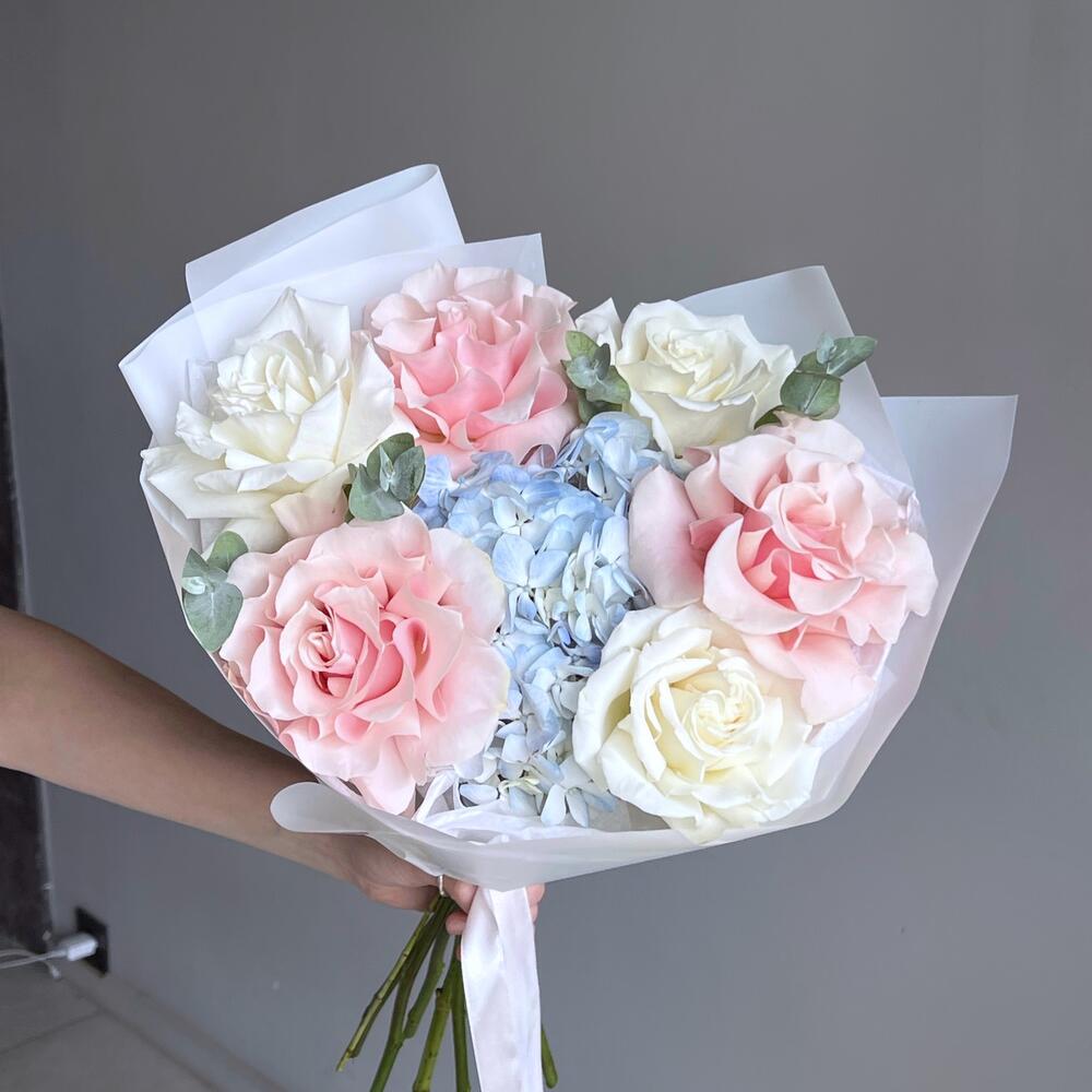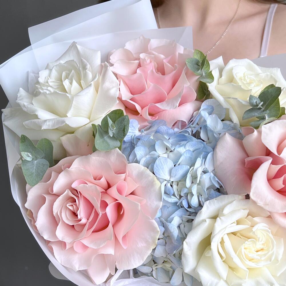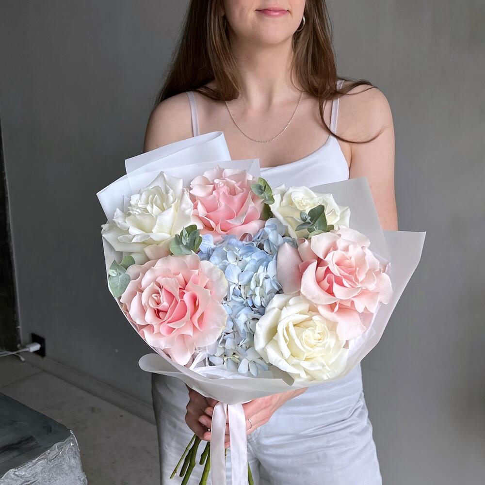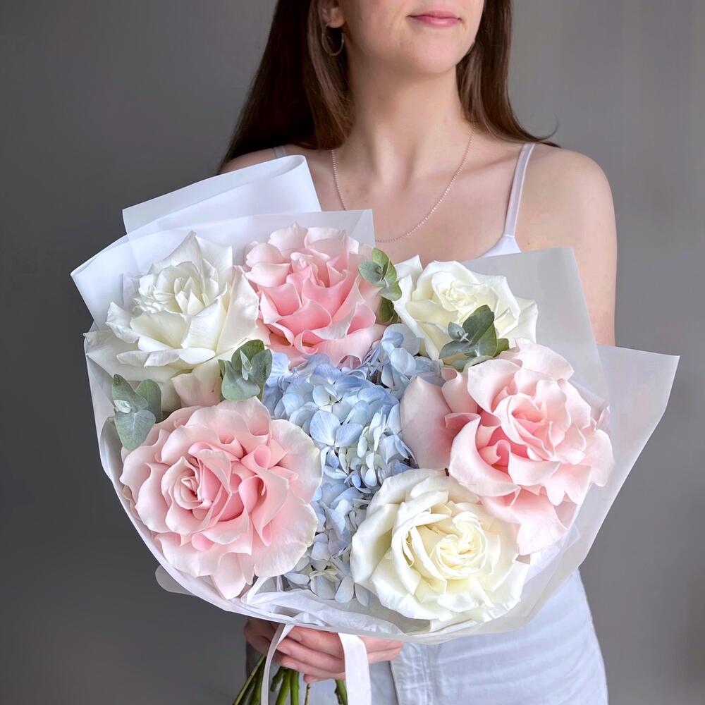 Букет гортензия, французская роза и эвкалипт