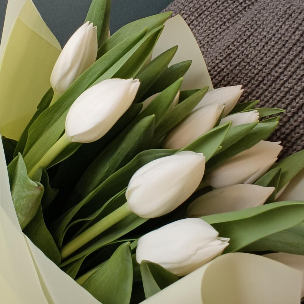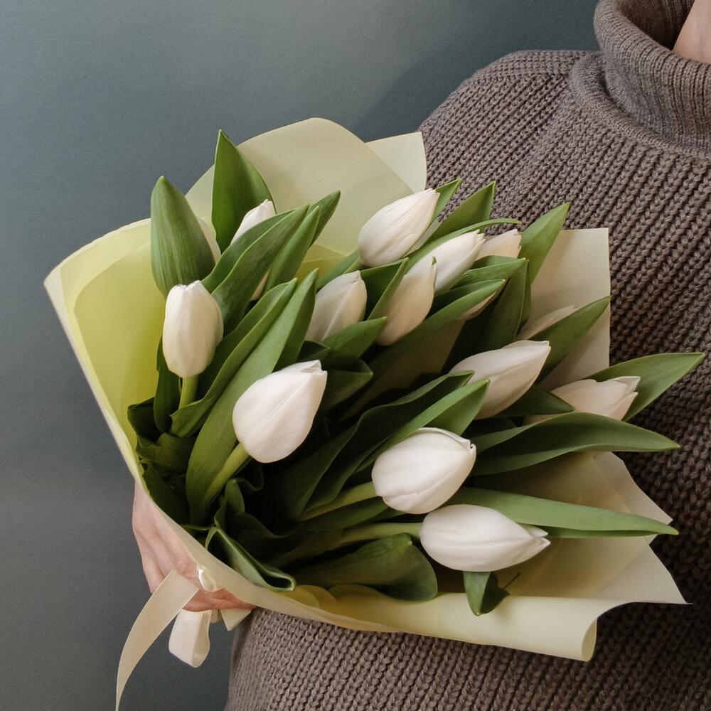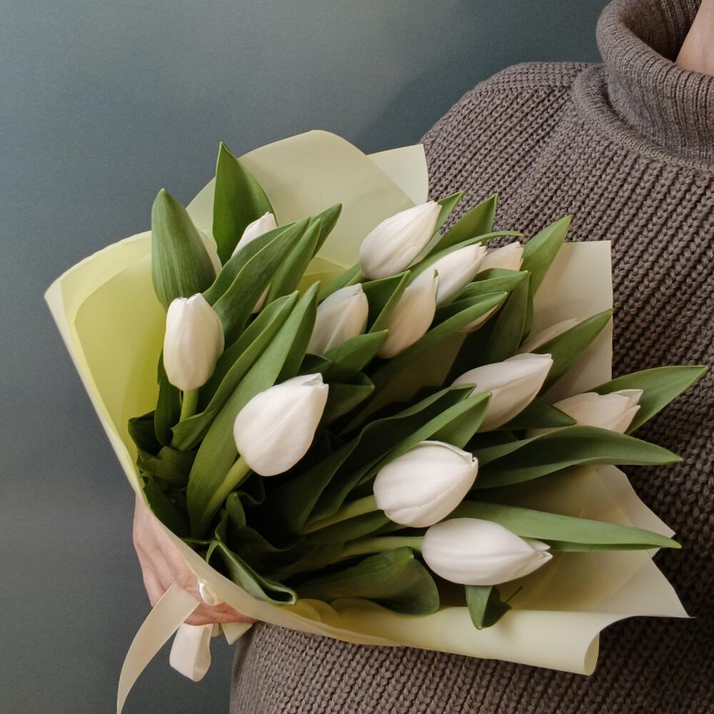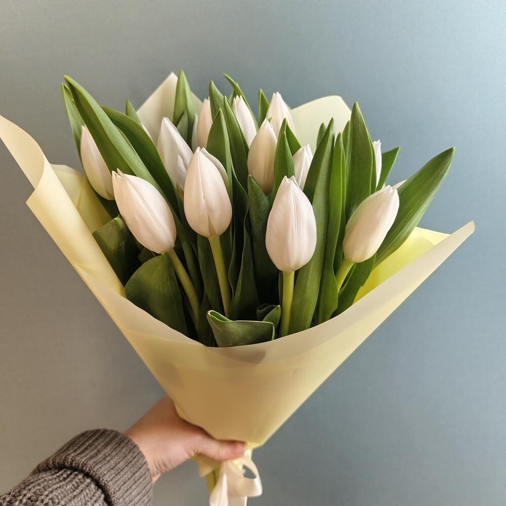 Букет из 15 белых тюльпанов в кремовом оформлении