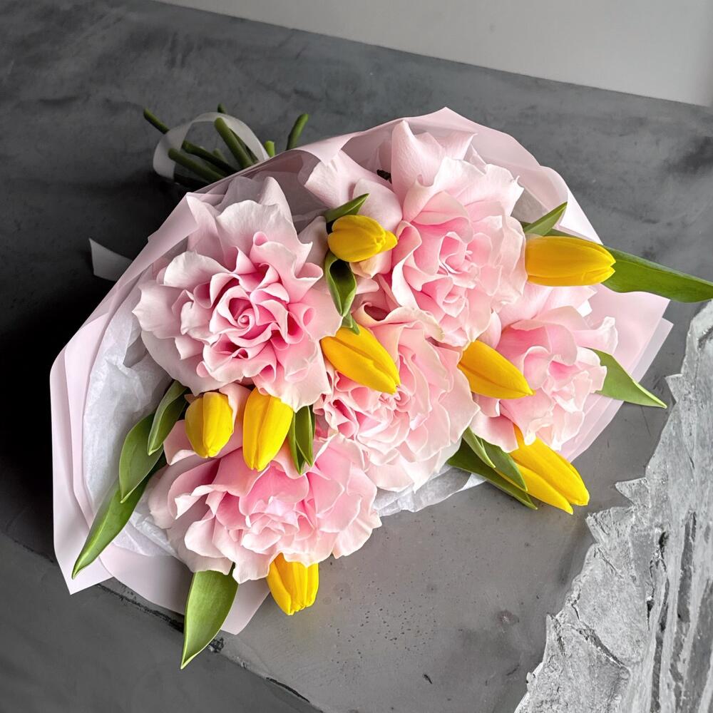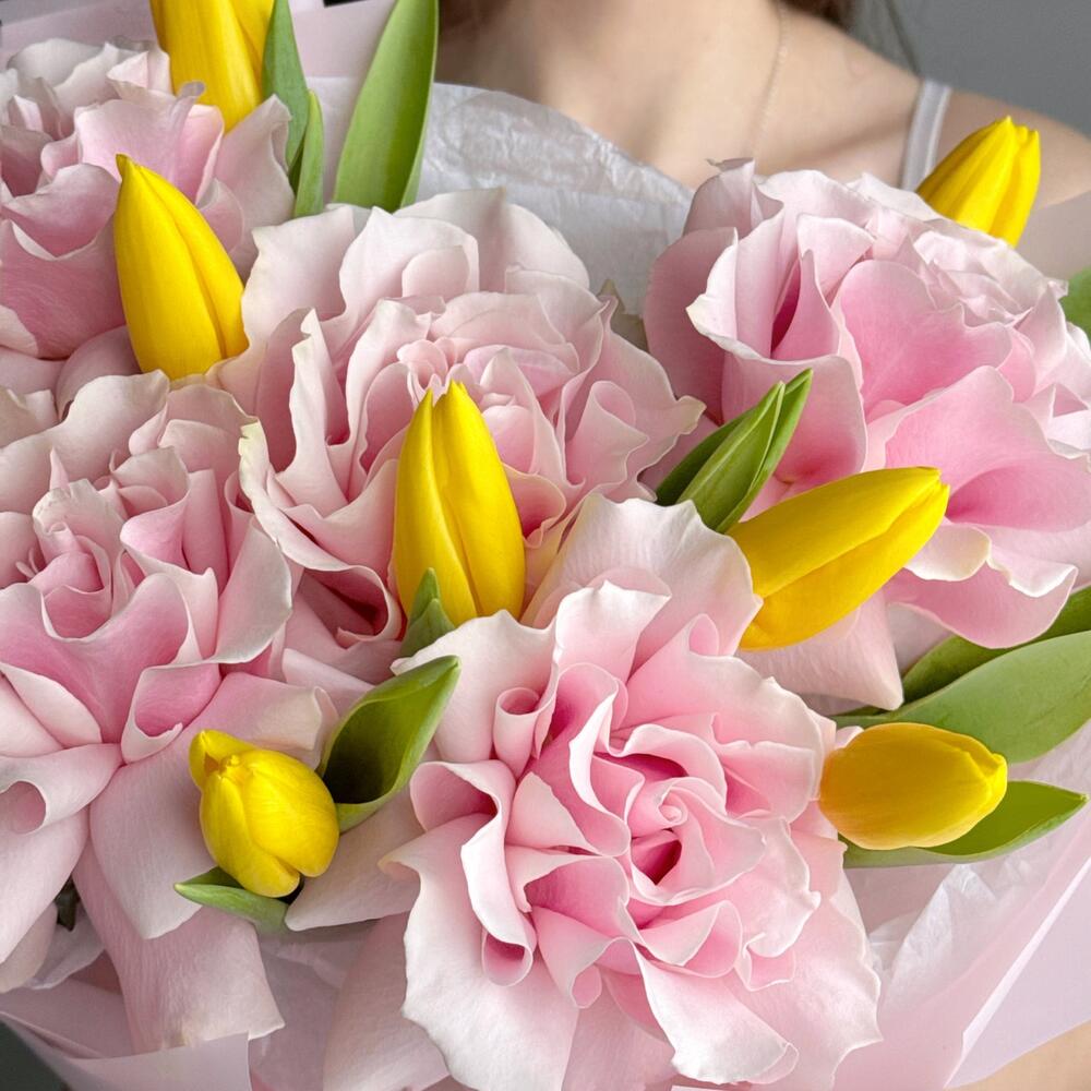 Букет из Французских роз и желтых тюльпанов