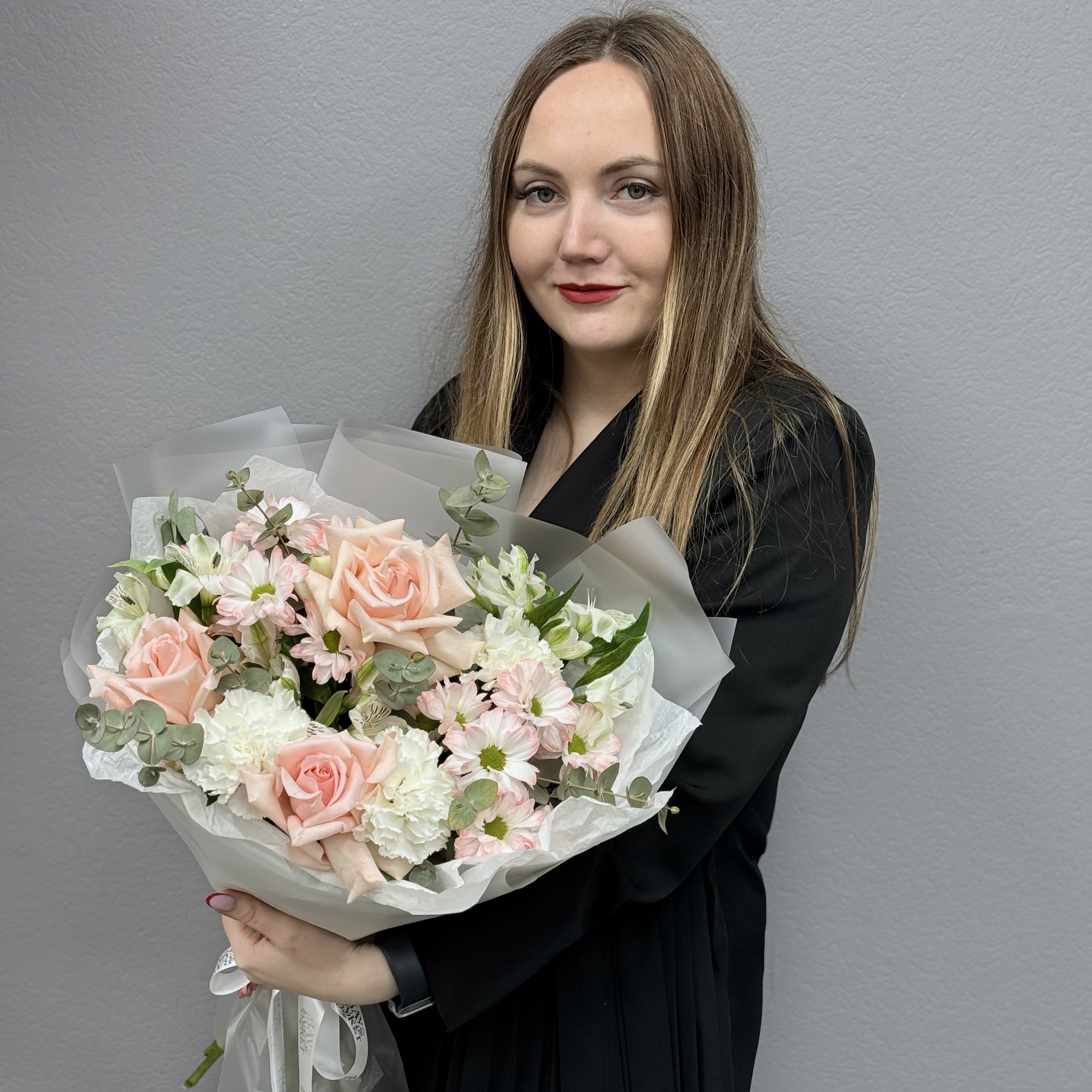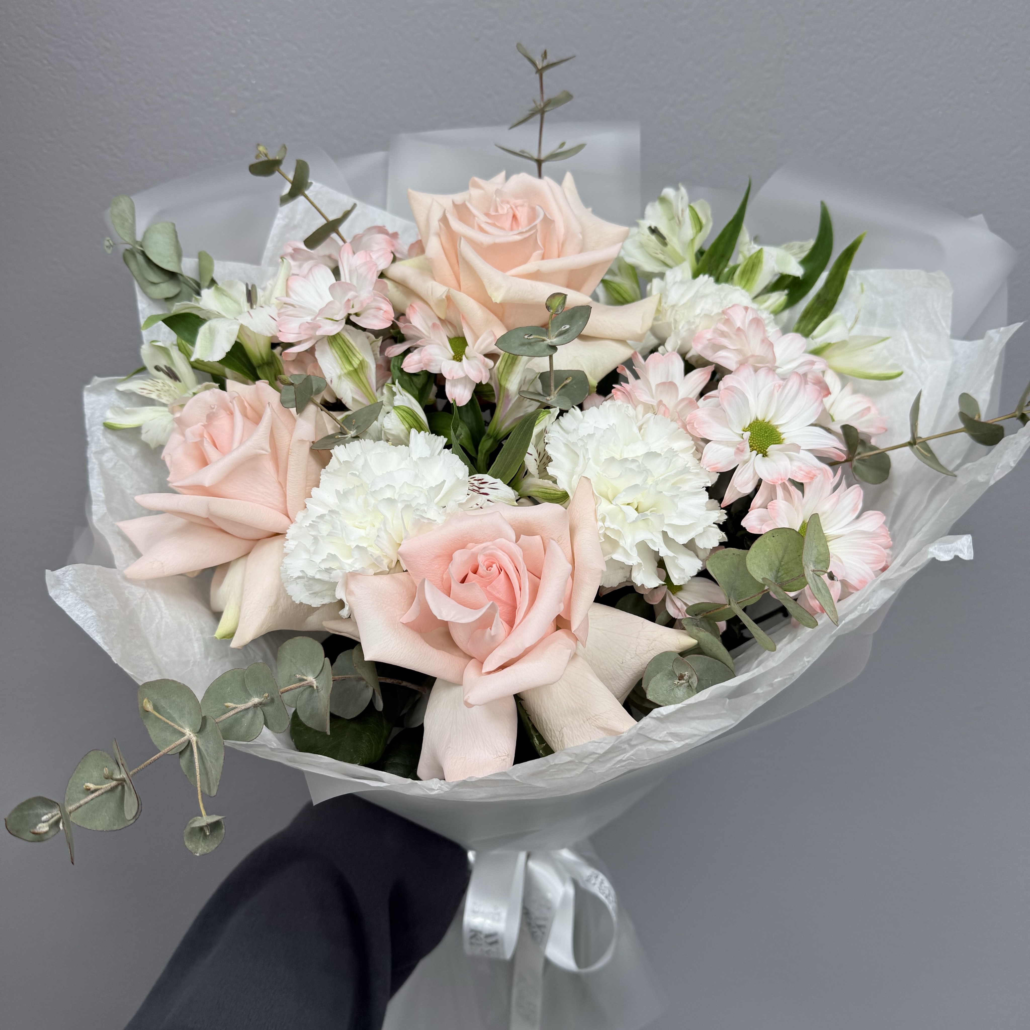 Букет из французской роз, альстромерии, диантусов и ромашек с эвкалиптом