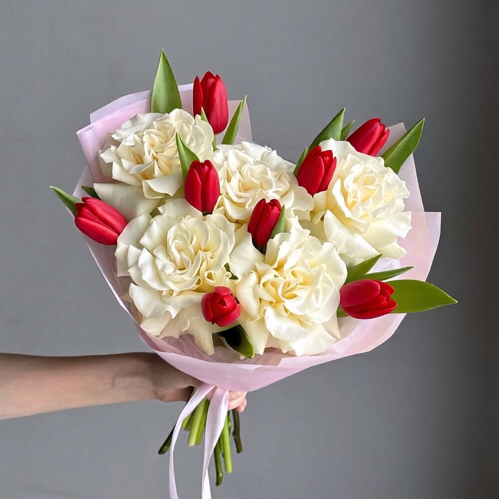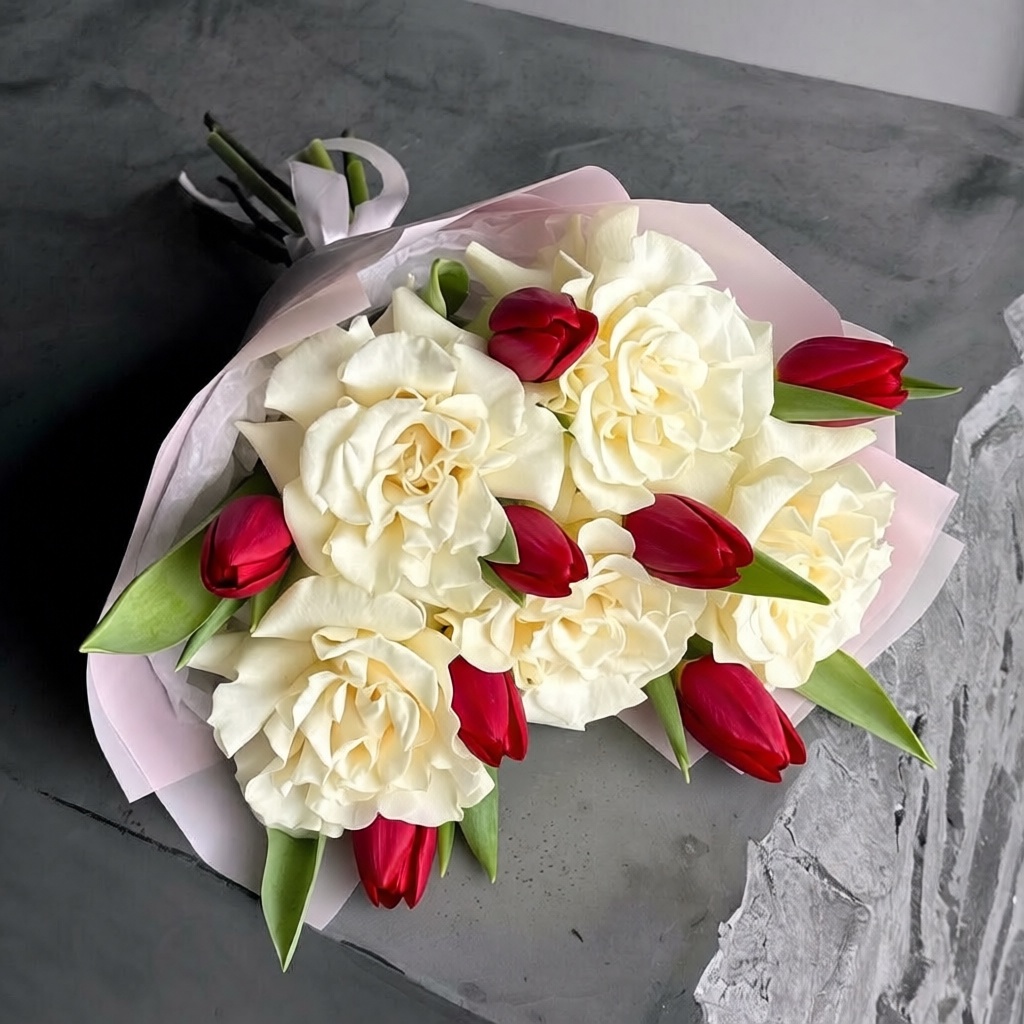 Букет из французской розы и красных тюльпанов