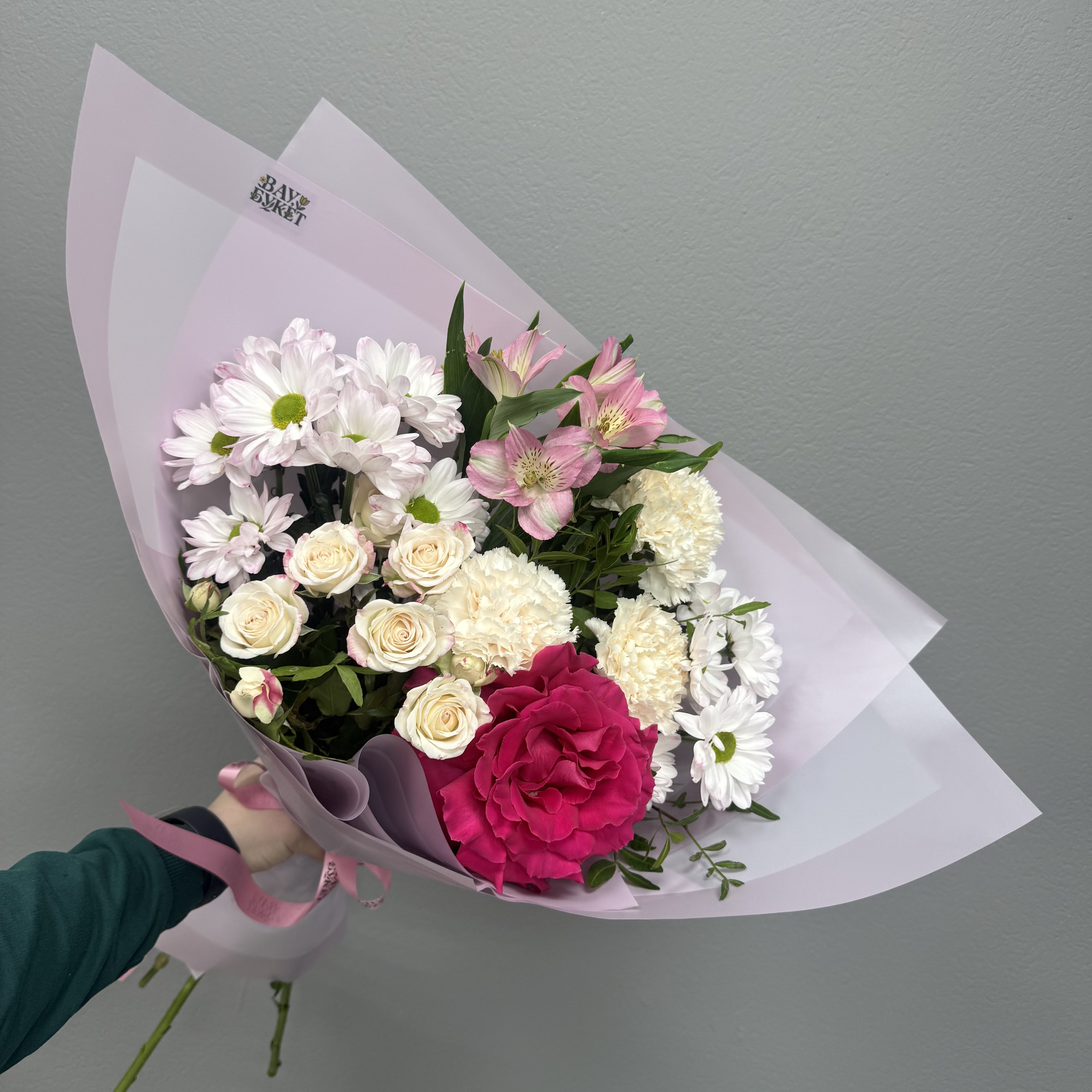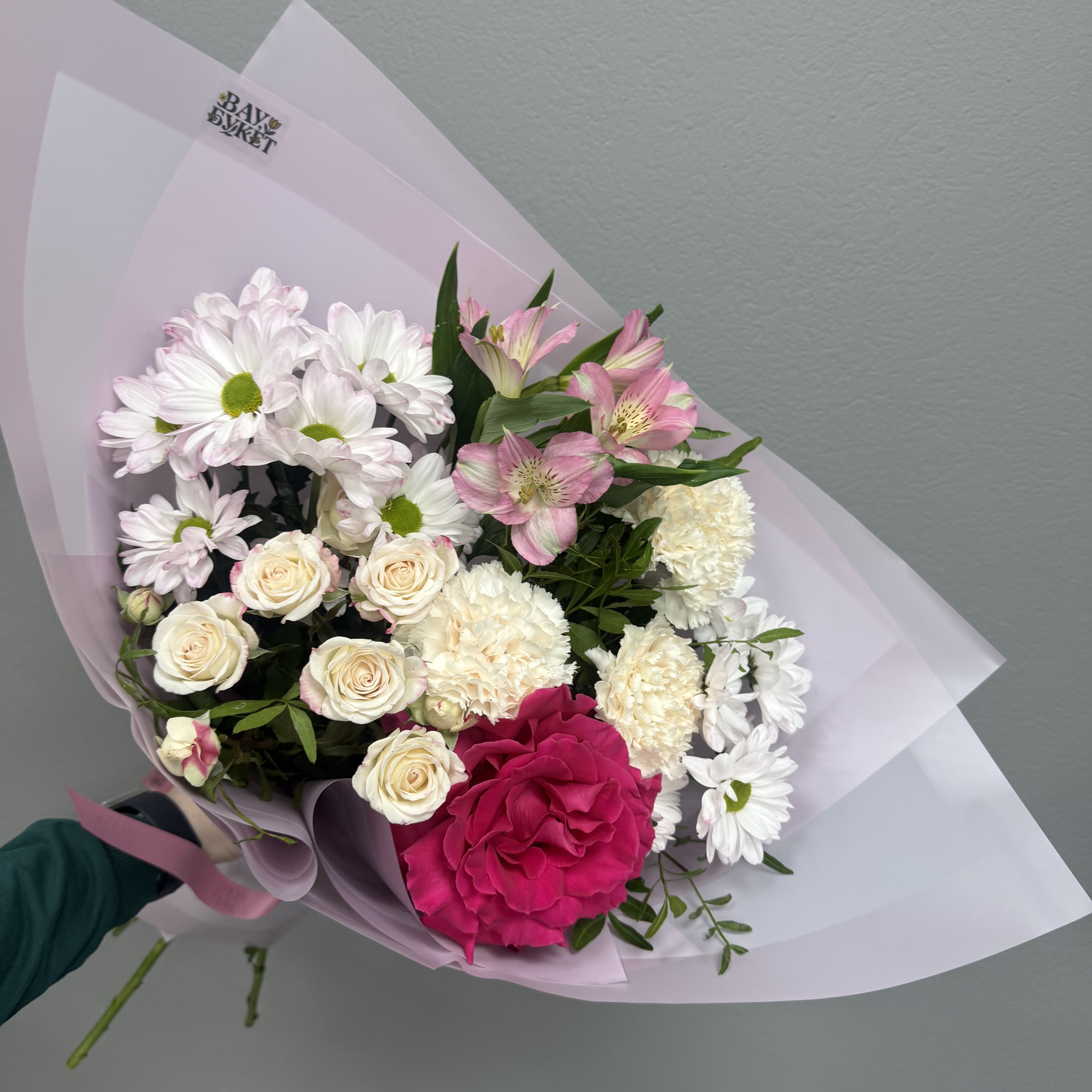 Букет из кустовой розы, ромашковой хризантемы и диантусов