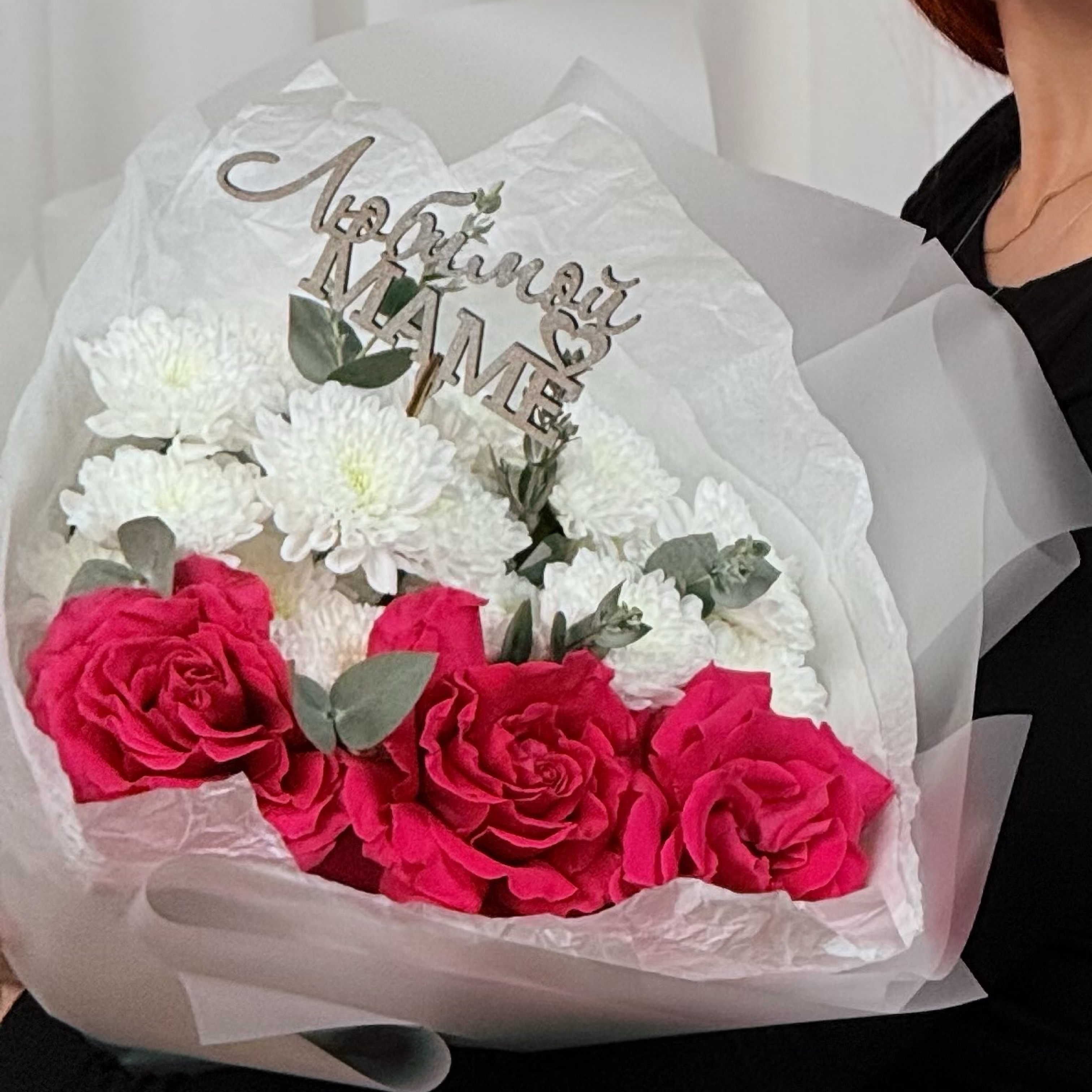 Букет из розовых французских роз и хризантем