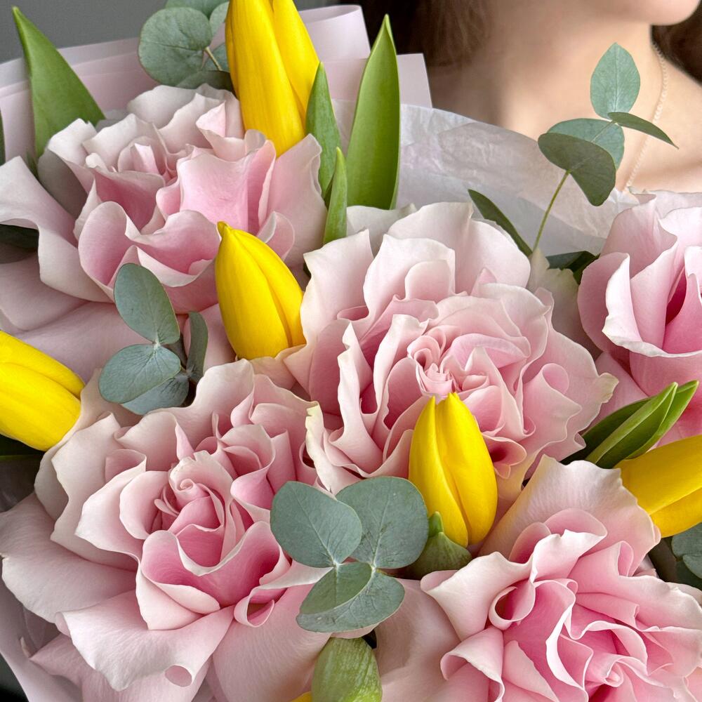 Французские розы, желтые тюльпаны с эвкалиптом нежный букет