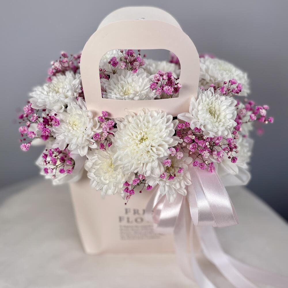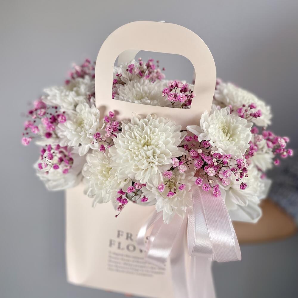 Гипсофила и хризантема в сумочке