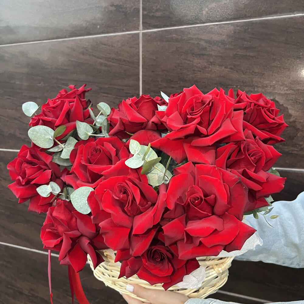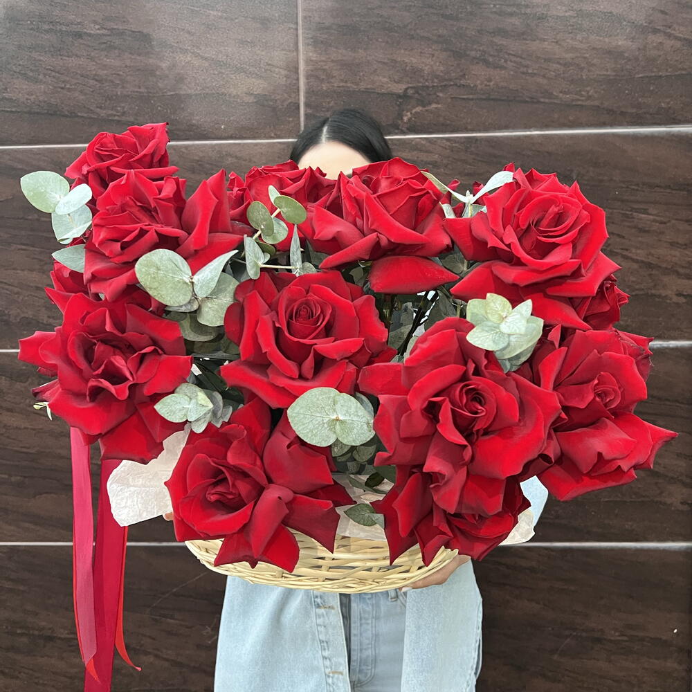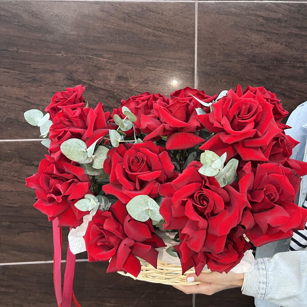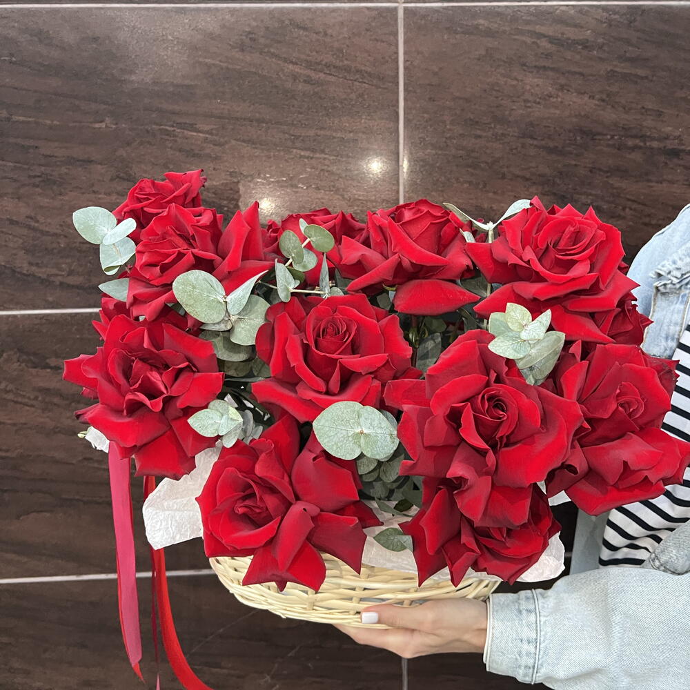 Композиция из красных французских роз и ароматного эвкалипта в корзине