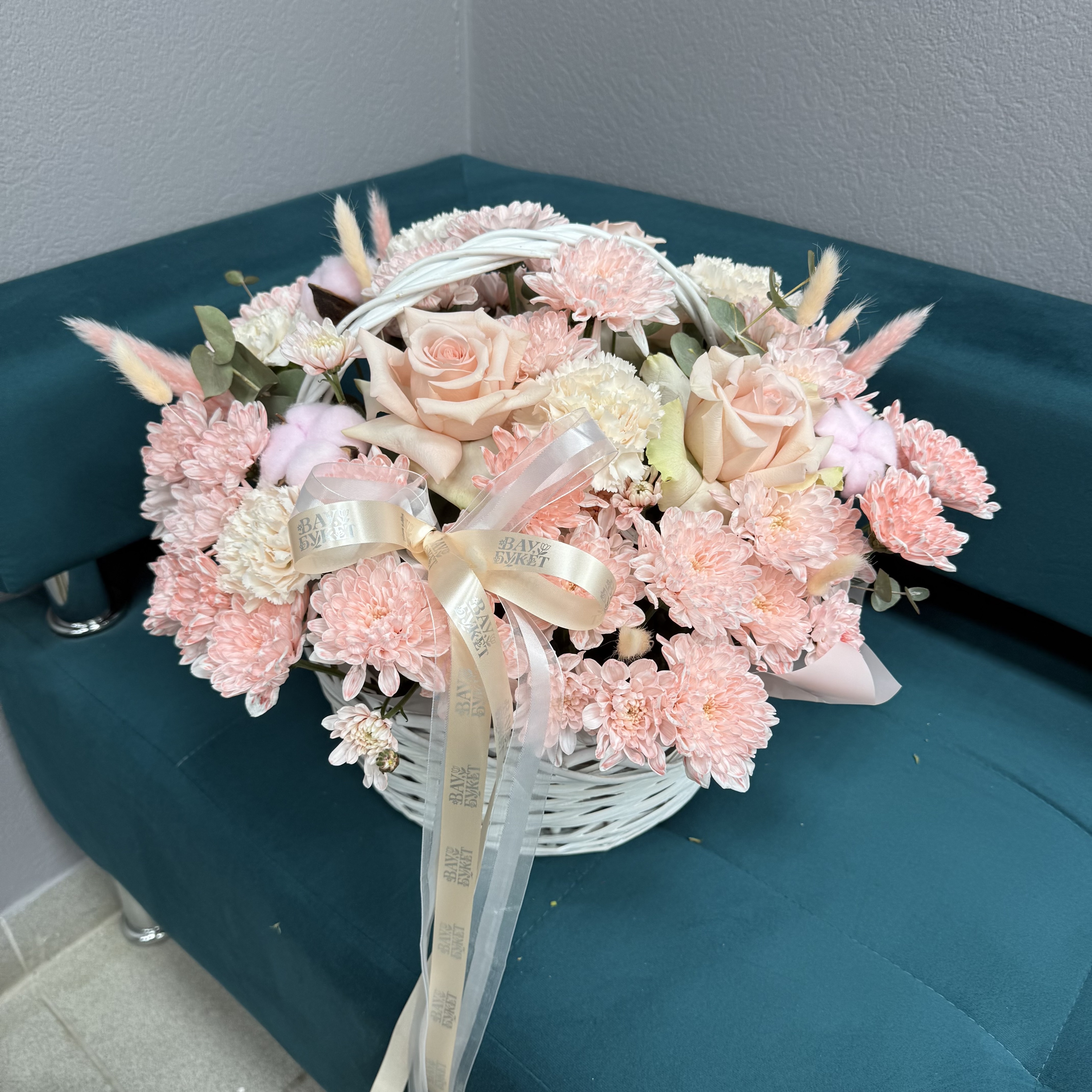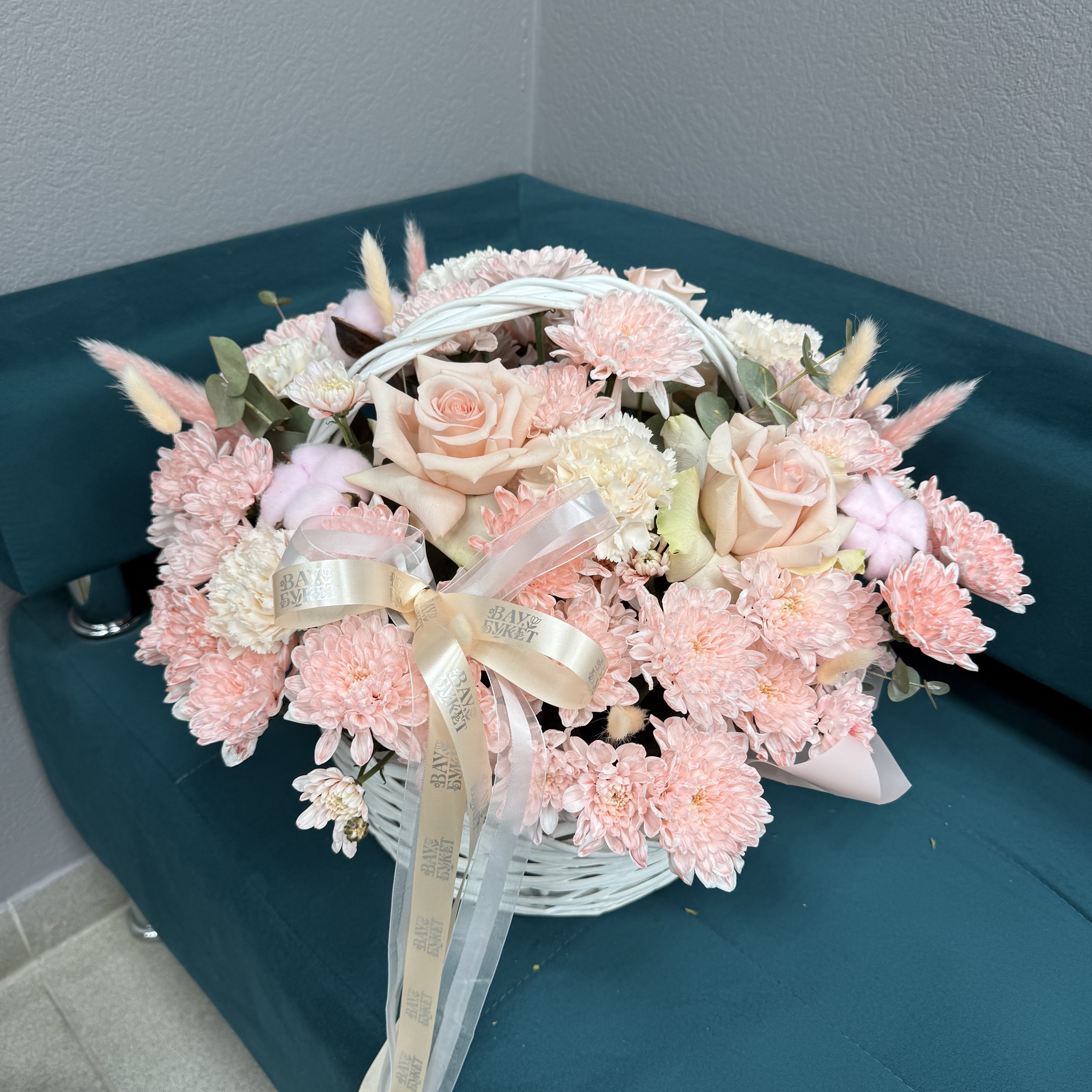 Корзина из кустовых хризантем, французских роз и сухоцветов