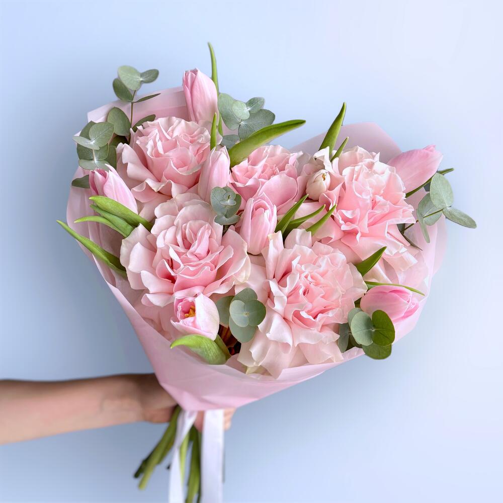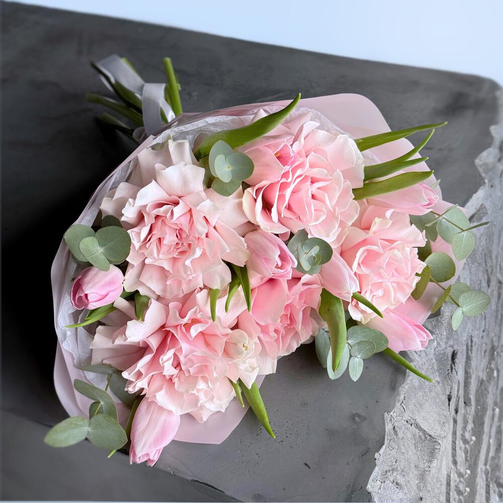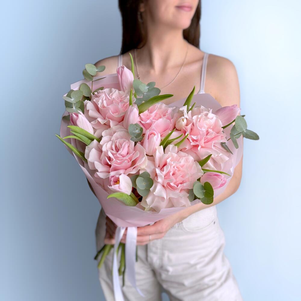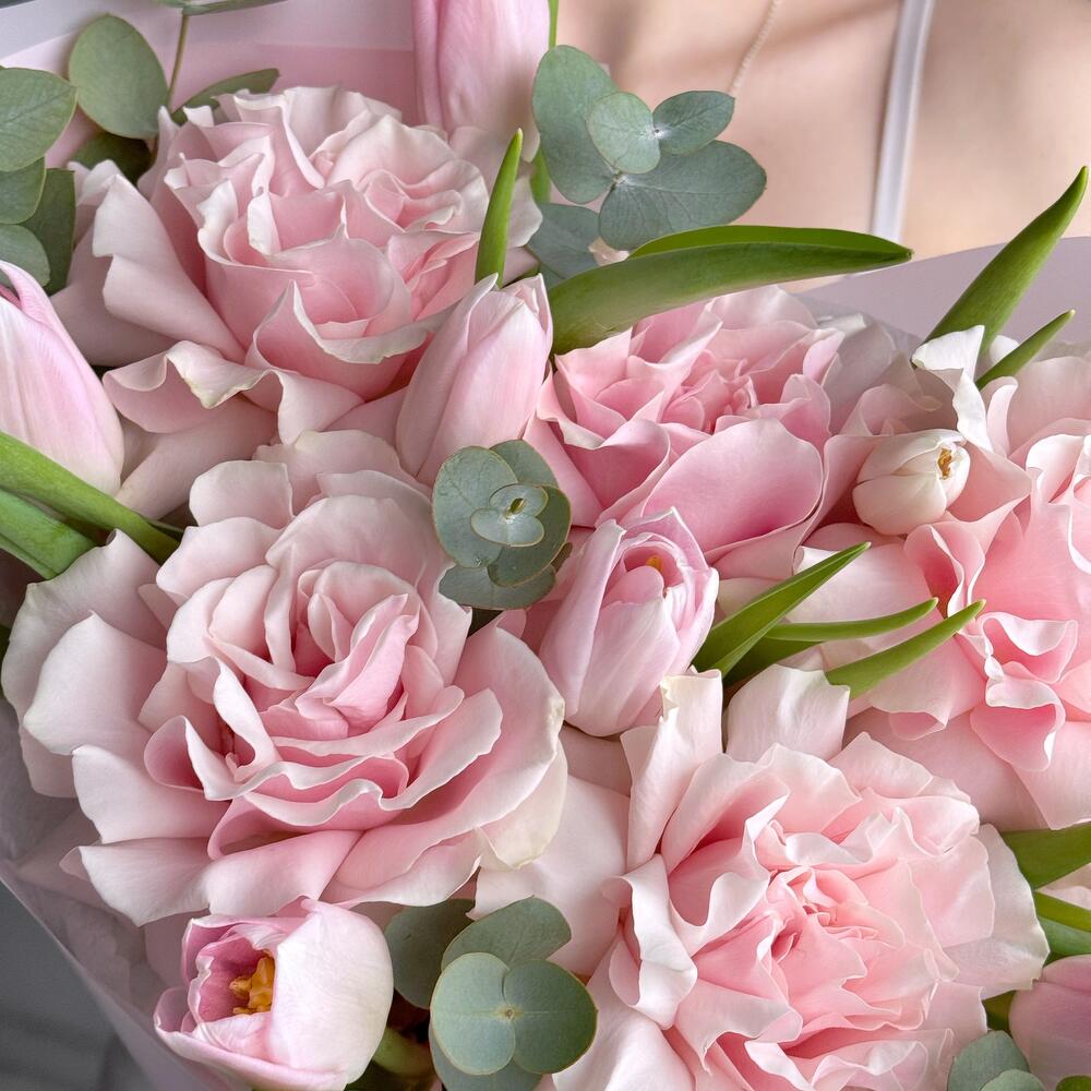 Нежный букет французские розы и тюльпаны с эвкалиптом