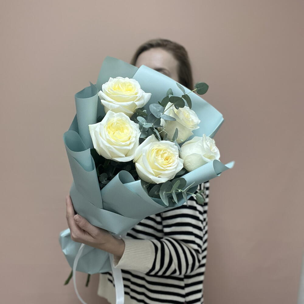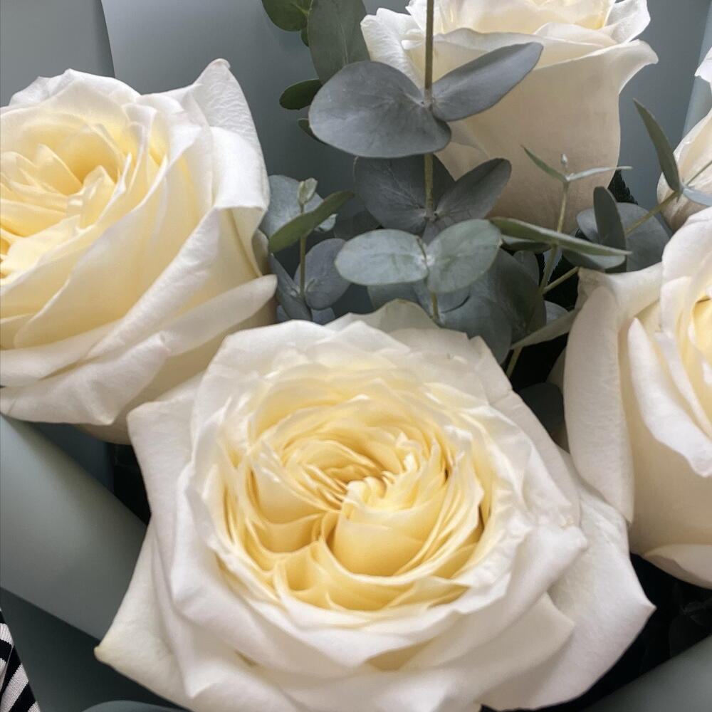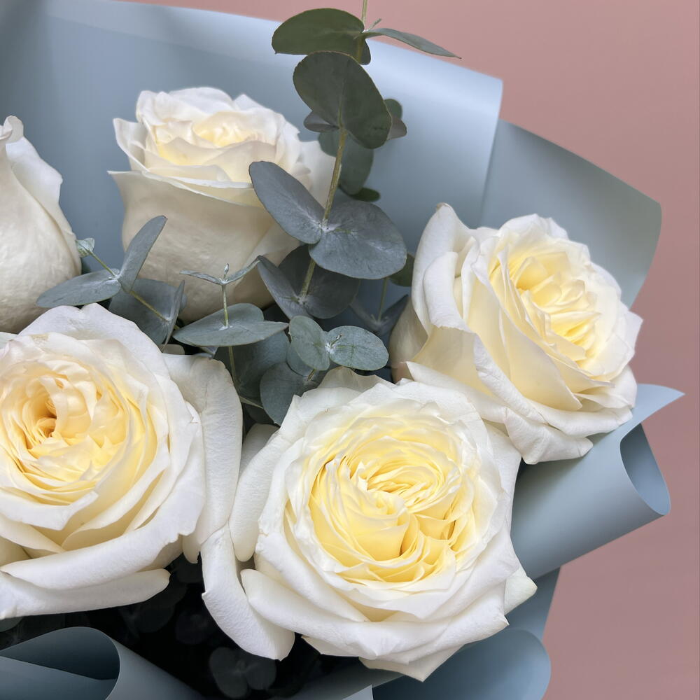 Нежный букет из ароматных пионовидных роз с эвкалиптом